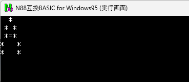 10 cls 20 DIM A$(4,4) 30 for i=0 to 4 40 for j=0 to 4 50 A$(i,j)=" " 60 next j,i 70 A$(2,0)="*": A$(1,1)="*": A$(3,1)="*": A$(1,2)="*": A$(3,2)="*": A$(0,3)="*": A$(4,3)="*": A$(0,4)="*": A$(4,4)="*":A$(2,2)="=" 80 for i=0 to 4 90 for j=0 to 4 100 locate i,j:print A$(i,j); 110 next i,j