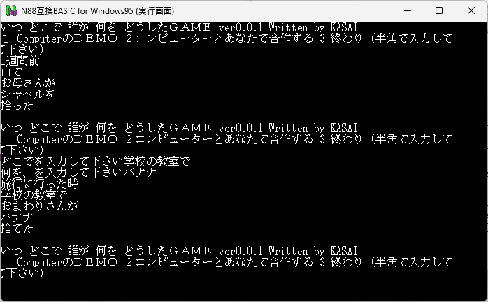 10 '** いつどこで誰が何をどうしたGAME ver0.0.1** 15 '** N88互換BASIC用 Written ByKASAI ** 20 dim when$(11), where$(15),who$(11),what$(12),verb$(10) 25 restore 500 30 for i=0 to 11 40 read when$(i) 50 next 55 restore 510 60 for i=0 to 15 70 read where$(i) 80 next 85 restore 520 90 for i=0 to 11 100 read who$(i) 110 next 115 restore 530 120 for i=0 to 12 130 read what$(i) 140 next 145 restore 540 150 for i=0 to 10 160 read verb$(i) 170 next 180 randomize val(right$(time$,2)) 190 print "いつ どこで 誰が 何を どうした GAME ver0.0.1 Written by KASAI" 200 print "1 ComputerのDEMO 2コンピューターとあなたで合作する 3 終わり(半角で入力して下さい)" 210 a$=input$(1) 220 if a$="1" then gosub 300 230 if a$="2" then gosub 400 235 if a$="3" then end 240 goto 190 300 print when$(int(rnd*12)) 310 print where$(int(rnd*16)) 320 print who$(int(rnd*12)) 330 print what$(int(rnd*13)) 340 print verb$(int(rnd*11)) 350 print:return 400 input "どこでを入力して下さい",whe$ 410 input "何を、を入力して下さい",wha$ 415 print when$(int(rnd*12)) 420 print whe$ 425 print who$(int(rnd*12)) 430 print wha$ 440 print verb$(int(rnd*11)) 450 print:return 500 data きのう,今日,おととい,1年前,朝,昼,真夜中,夏休み,旅行に行った時,1週間前 505 data 冬,昼休み 510 data トイレで,家の前で,レストランで,公園で,階段で,駅で,デパートで,屋上で,バスの中で,机の上で 515 data 海で,山で,本屋で,花屋で,職員室で,社長室で 520 data 僕が,赤ちゃんが,弟が,お母さんが,おじさんが,おまわりさんが,猫が 525 data アメリカ人が,いぬが,友達が,先生が,金髪の美人が 530 data バナナの皮を,うんちを,アイスクリームを,シャベルを,ボールを,本を 535 data 1000円札を,団子を,コンピューターを,ぽけもんを,飴を,本を,花を 540 data 食べた,拾った,投げた,蹴飛ばした,踏み潰した,ポケットに入れた,捨てた 550 data 眺めた,飛び越えた,見つけた,踏んづけてころんだ