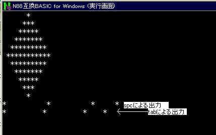 spc,tab はprint文の中でのみ使います。以下のプログラム例で違いを把握して下さい。