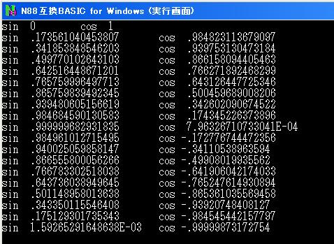 10°毎のSIN,COSの値をファイルに書き込み、それを読み出して表示するプログラムです。