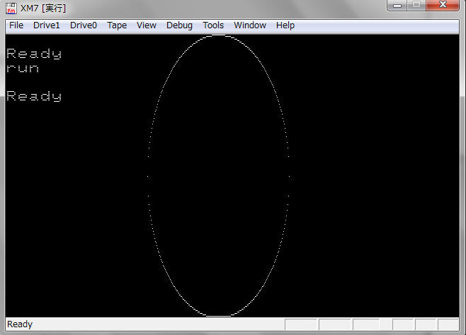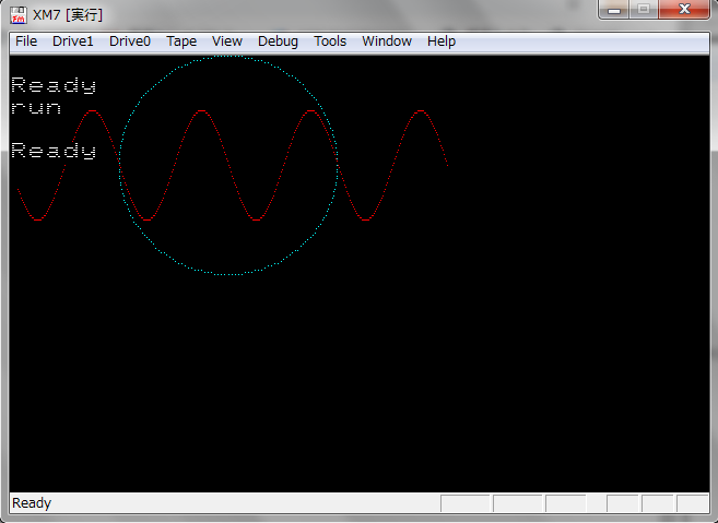 エミュレータXM-7の場合は、縦:横 = 2:1なので縦を1/2にすると本来の円、Sinカーブが描けます。