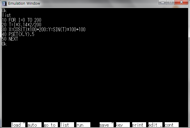 | 220 for i=0 to 200 225 t=i*3.14*2/200 230 x=cos(t)*100+200:y=sin(t)*100+100 240 pset(x,y),5 250 next 260 for i=0 to 400 270 t=i*3.14*2/100 280 x=i:y=sin(t)*50+300 290 pset(x,y),2 300 next |