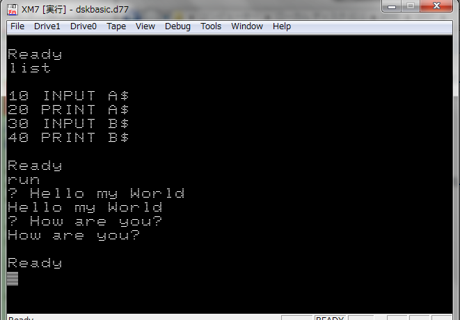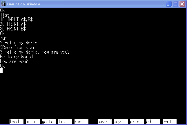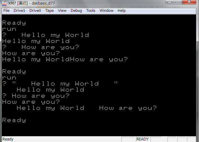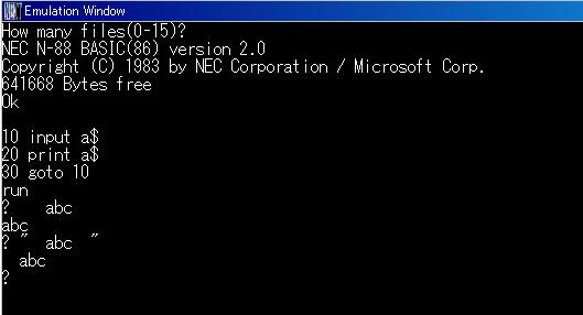 N88Basic、F-Basicでは、文字列の前後にある空白は入力されません。前後の空白も入力したい時は、