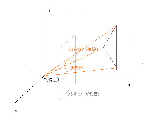 透視投影図法では図1のように、物体から原点(視点)に投影線が収束します。