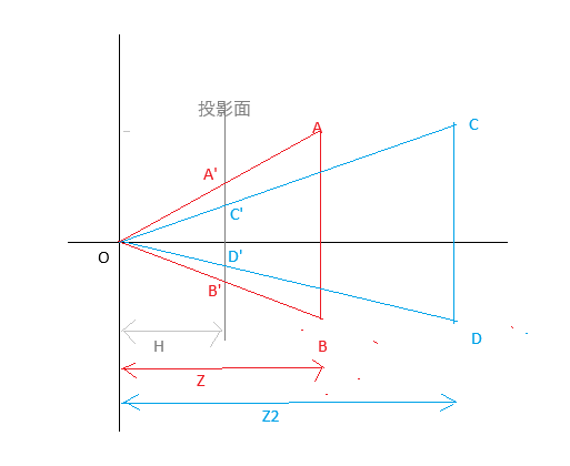 原点(視点)から距離H離れた投影面と、投影面と平行な線分AB、CDを考えます。