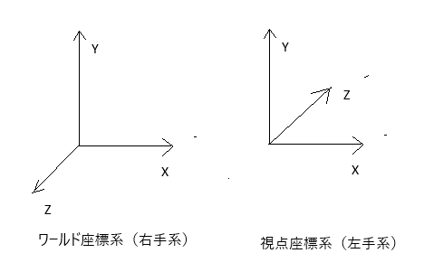 3次元空間に用いられる座標系には、ワールド座標系(右手系)、視点座標系(左手系)があります。