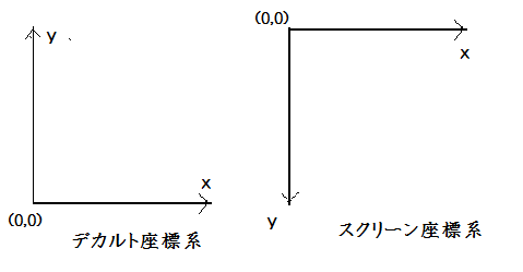 コンピュータ上では、左上が原点(0,0)でy軸の下方向が正、x軸の右方向が正になる座標系(スクリーン座標系