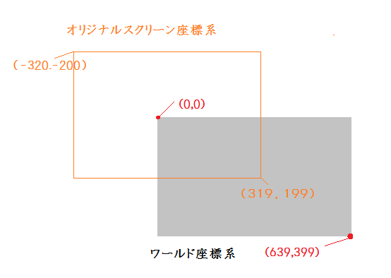 下の図では原点はワールド座標系の(320,200)に位置することになります。