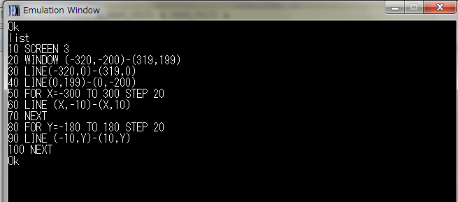 これは不便なので、以下のようにWINDOW命令により画面の左上は(-320,-200)、画面の真ん中に原点(0,0)、
