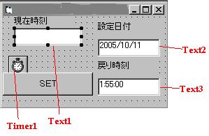 [SET]ボタンを押すと、fが1にセットされ、1分毎にシステムの現在時刻をText3に設定した時刻(変数settimeに代入されている)に戻す動作になります。