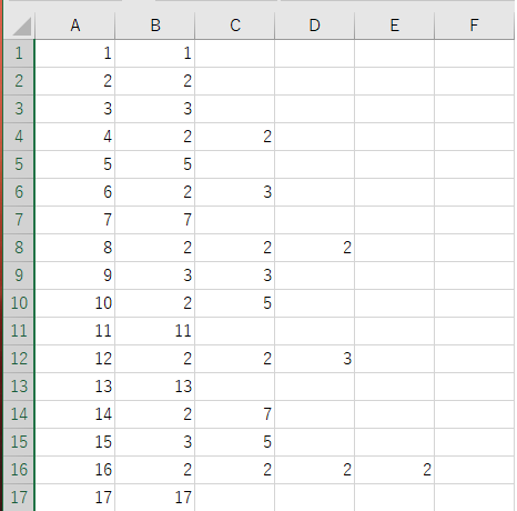という行が肝で、ある自然数が素数の場合は素因数はB列のみでC列以降は空のセルになります。