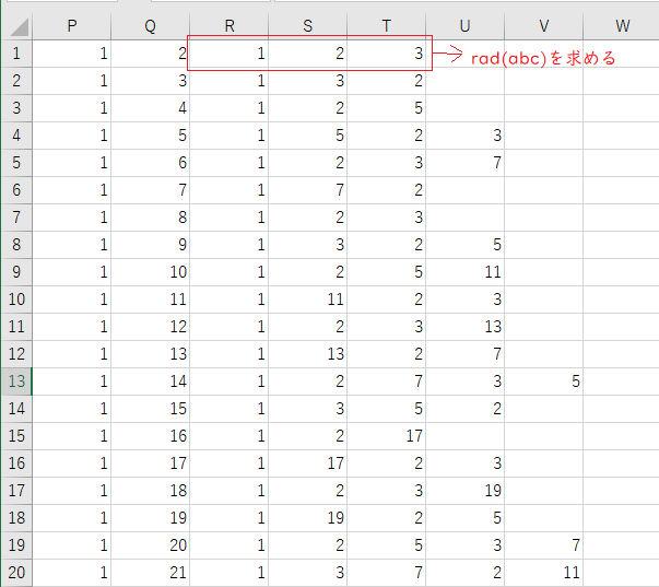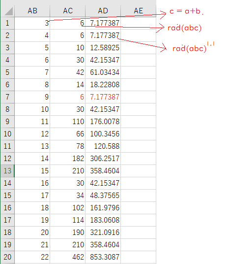 EXCELに c > rad(abc)1+ε となる(a,b,c)の組を見つけさせてみるということをやってみます。