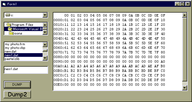| Dim b() As Byte '配列bをByte型として宣言 Dim t$ Text2.Text = "" f$ = File1.Path + "\" + Text1.Text 'f$ オープンするファイル名 Open f$ For Binary As #1 s = LOF(1) 'ファイルのサイズを変数sに読み込み ReDim b(s) '配列の大きさをs(ファイルサイズ)に変更 Get #1, , b() '配列b()に読み込み Close '以下は表示。Text2.Textにダンプ表示する。 t$ = t$ + " " For i = 0 To 15 t$ = t$ + "0" + Hex$(i) + " " Next t$ = t$ + Chr$(13) + Chr$(10) For i = 0 To s - 1 If (i Mod 16) = 0 Then t$ = t$ + Right$("000" + Hex$(i), 4) + ":" End If t$ = t$ + Right$("0" + Hex$(b(i)), 2) + " " If (i Mod 16) = 15 Then t$ = t$ + Chr$(13) + Chr$(10) End If Next Text2.Text = t$ |