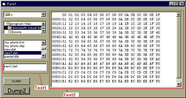 上の例は、「Dump2」ボタンをおした時のものですが、そのコードの部分を以下に抜粋して載せます。