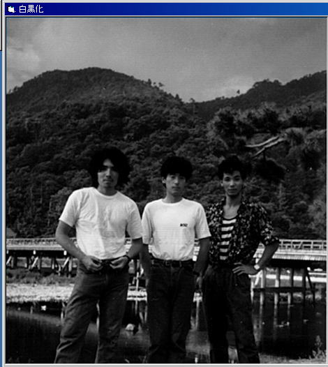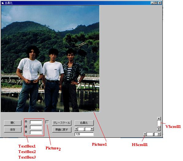 | Private Sub Command3_Click() Dim r, g, b, y As Long w = Picture1.Width h = Picture1.Height For i = 1 To w For j = 1 To h ' @RGB値の取得 color = Picture1.Point(i, j) ' Ar,g,bをyに変換 r = (&HFF And color) g = (&HFF And (color \ &H100)) b = (&HFF And (color \ &H10000)) y = 0.3 * r + 0.59 * g + 0.11 * b ' B変換した灰色で塗る Picture1.PSet (i, j), RGB(y, y, y) Next j Next i End Sub |