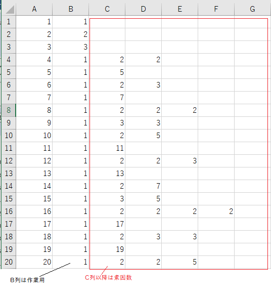 C列以降に素因数を保存していきます。