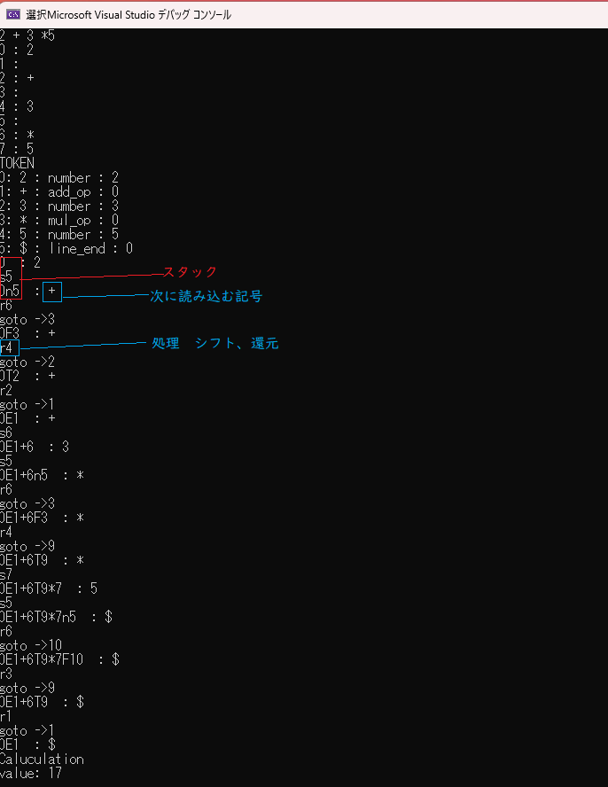 スタックの表記の意味は姉妹サイト「構文解析(上昇解析)」をご参照下さい。