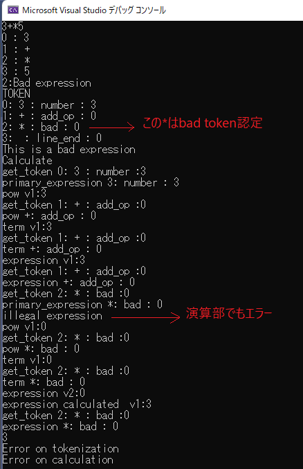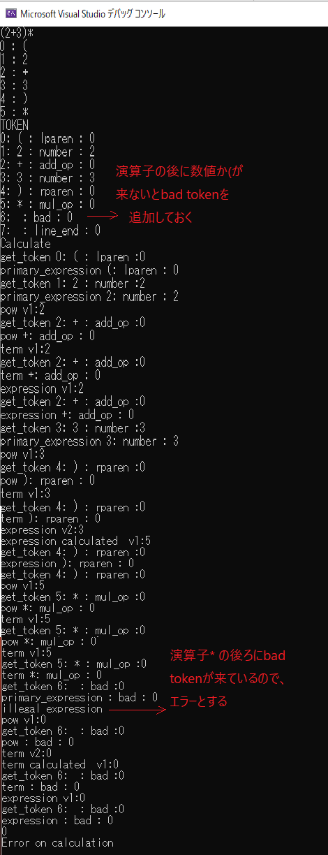 エラー処理は、字句判定の部分で行うこともできますし、演算部(構文解析部)に実装することもできます。