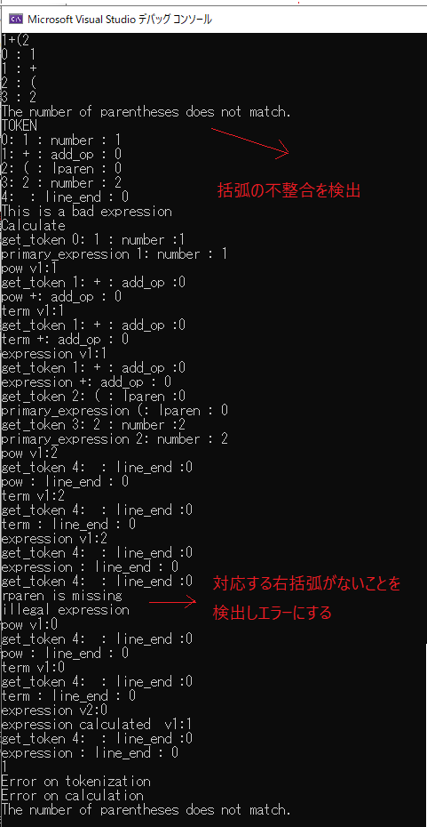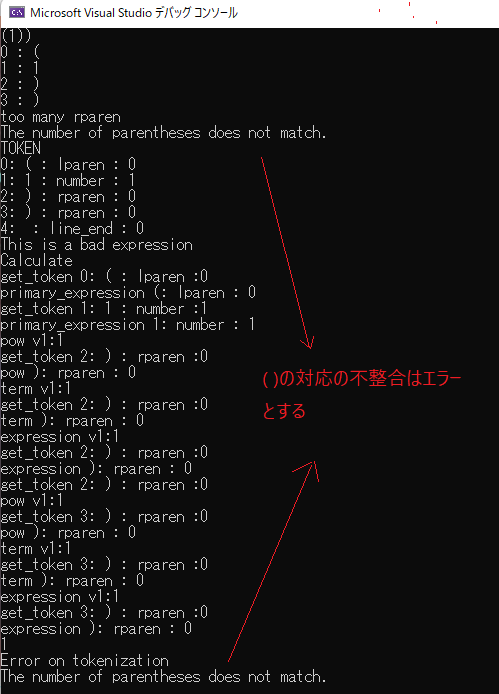 字句解析部でも演算部でも括弧の不整合を検出しエラーとしている。