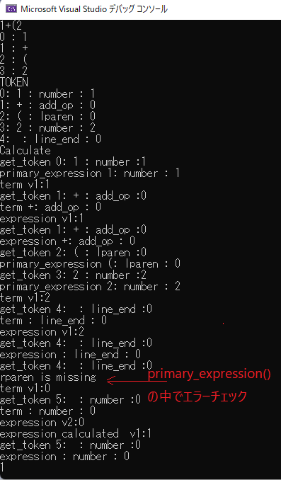 演算処理の関数primary_expression()の中で、右括弧")"で閉じらていないことはチェックしているが