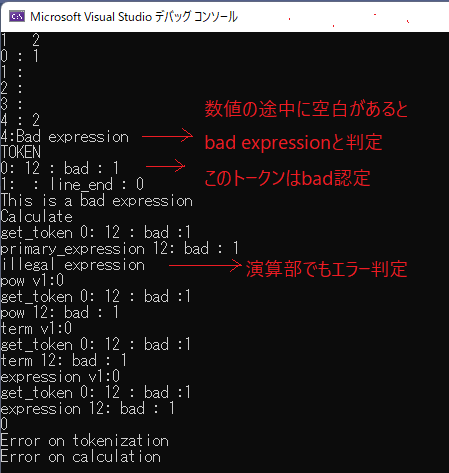 これは字句解析の個所で起きたエラーフラグは1、演算部分(再帰下降パース)で検出したエラーは10以上とすることで