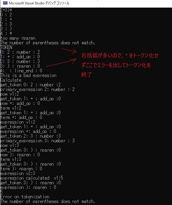 字句解析部で、右括弧")"が多いことを検出した部分で、エラーとし処理を中止